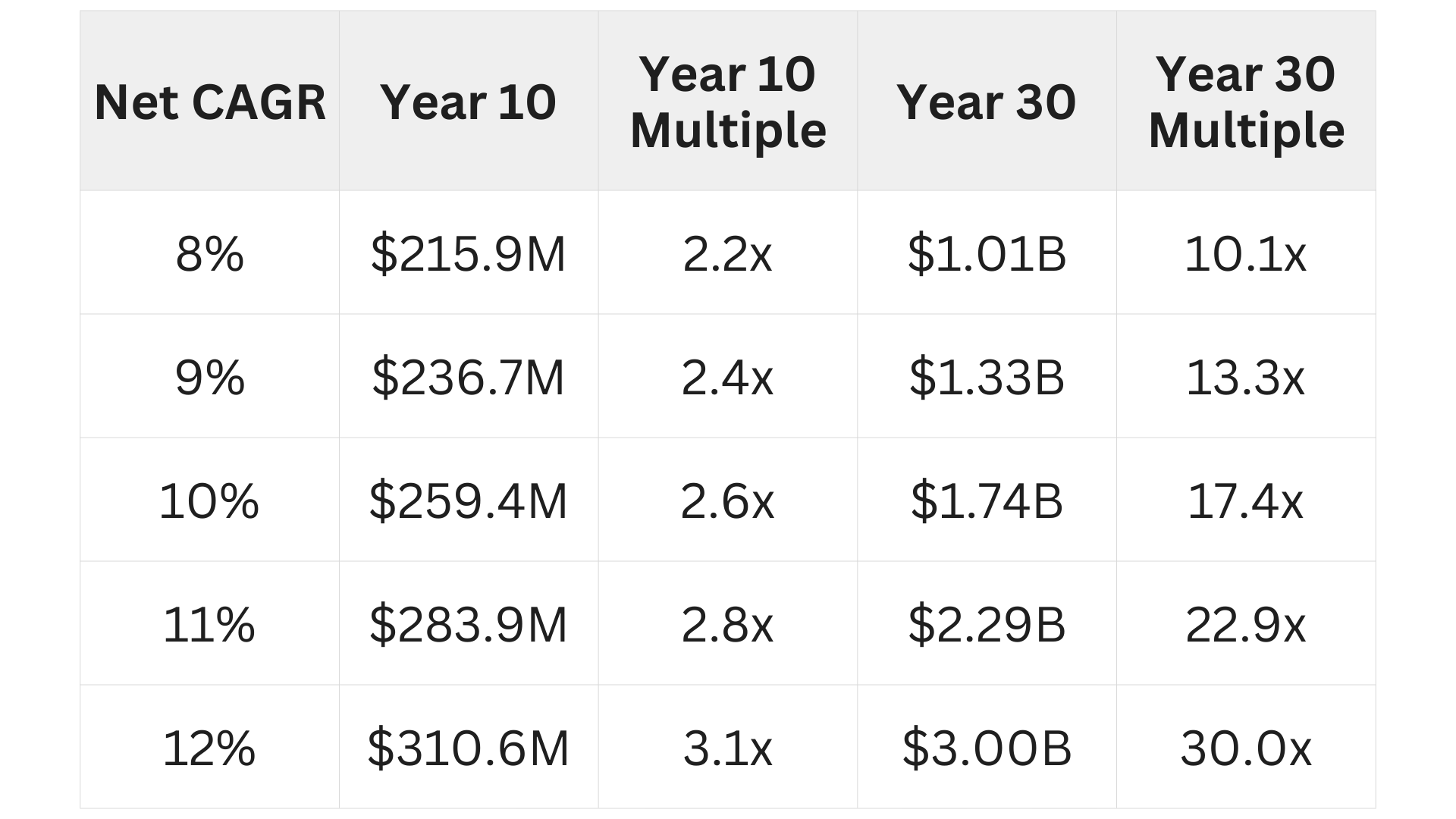 Unless my US$100m grows at 25.89%+ on average each year for a decade straight.