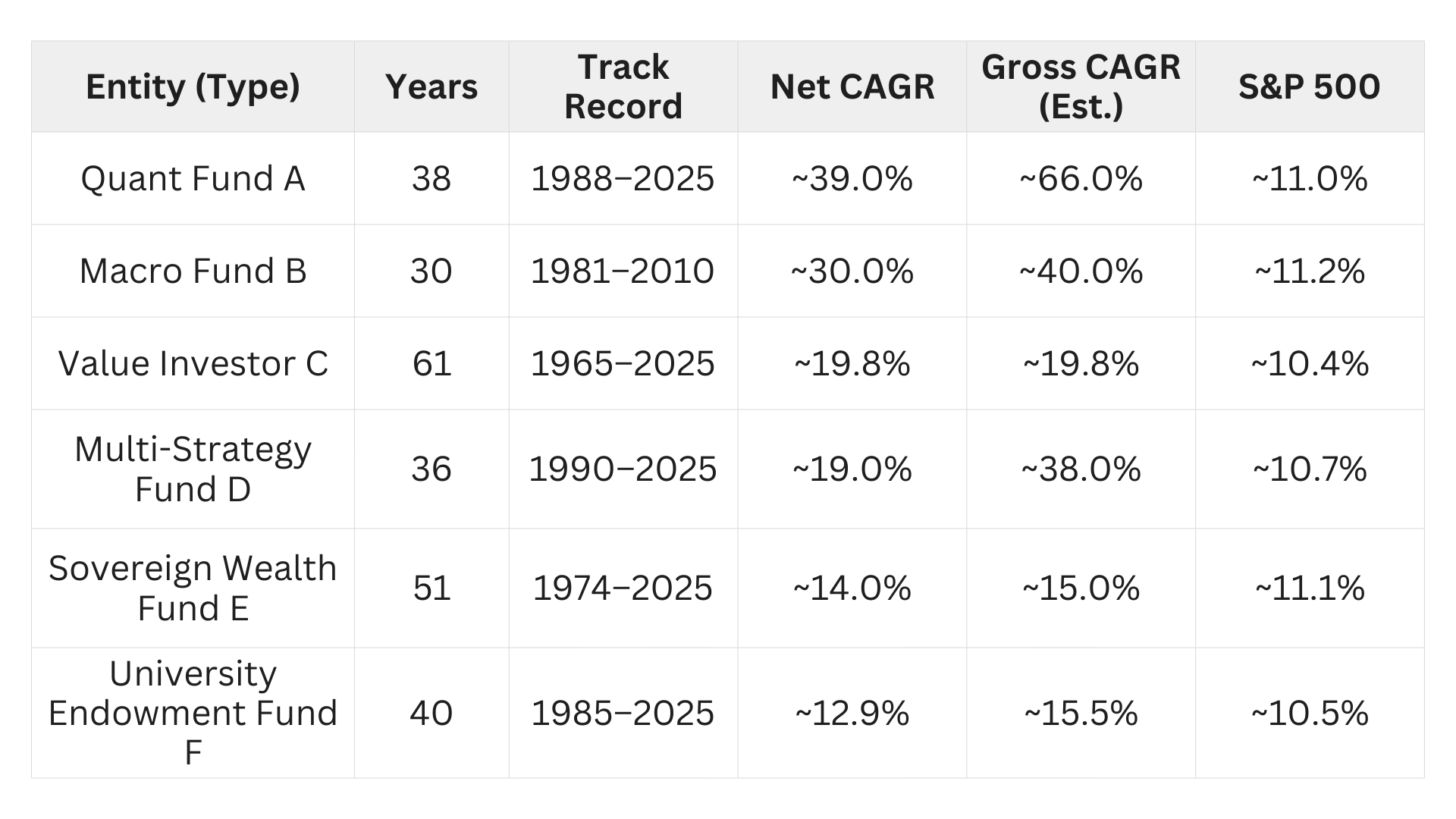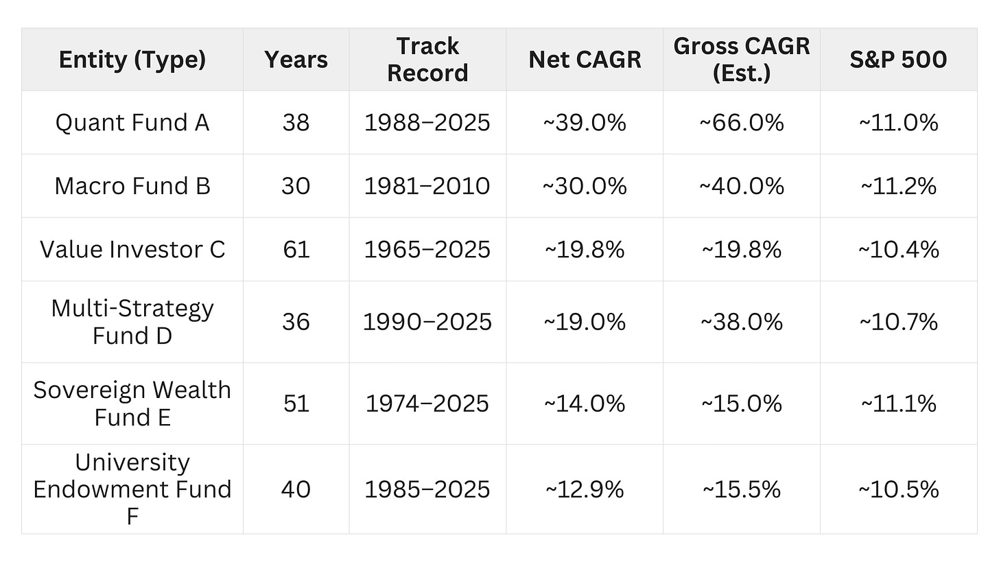 Let’s look at legendary investors who have managed over nine figs for over three decades and did rather well.